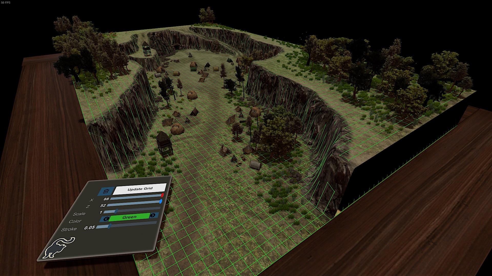 An improvement over the stock grids feature, this tool uses raycasts to detect objects in the game and draw a 3-dimensional grid that can adjust for terrain and obstacles. The player can choose the grid resolution, size, and style to get a grid that works for their custom battle map.